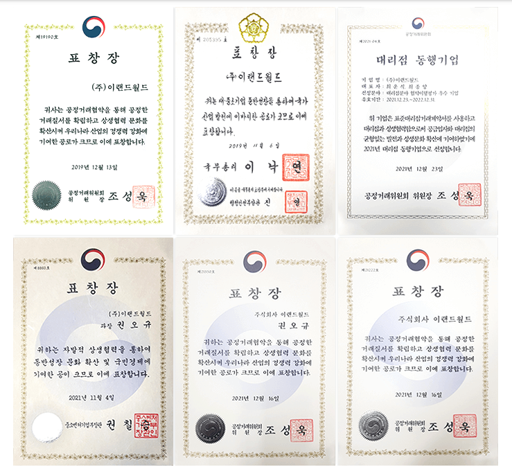 공정거래 위원회에서 2021년에 처음으로 대리점 동행기업을 선정했어요. 대한민국 대리점 분야에서 법준수와 상생을 잘 하고 있다고 평가하는 기업을 선정한 건데요. LG, 매일유업, 대상, 이랜드. 이렇게 4개 기업이 선정되었어요. 대리점 업태로 일하는 대기업은 정말 많은데 패션기업 중에서는 유일하게 저희가 선정이 되었죠. 저희는 특별히 법 준수 영역에 있어서 우수한 평가를 받았어요.